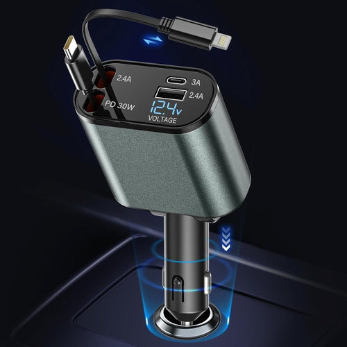 Brenth 69W Super Fast Car Phone Charger Adapter with Type-C & Lightning Retractable Cables, 4 in 1 USB C Car Charger Smart Charging Protection Voltage Display, Car Accessories for iPhone, Android